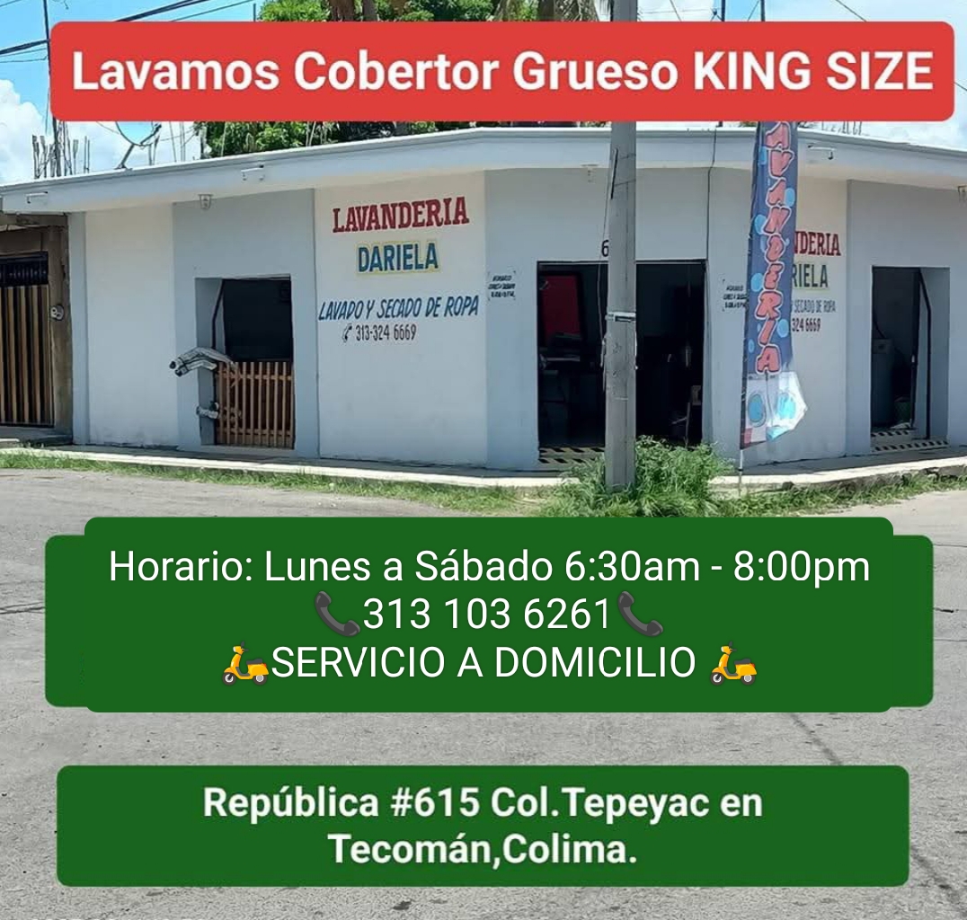 Lavandería Dariela — Lavandería Ubicado en Tecomán. Horario: lunes: 6:30–20:00; martes: 6:30–20:00; miércoles: 6:30–20:00; jueves: 6:30–20:00; viernes: 6:30–20:00; sábado: 6:30–20:00; domingo: 8:00–14:00 | Calificación: 4.8 (8 opiniones)