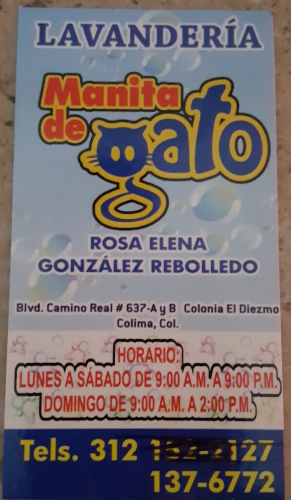 Lavanderia Por Carga De Ropa MANITA DE GATO — Lavandería Ubicado en Colima. Horario: lunes: 9:00–20:00; martes: 9:00–20:00; miércoles: 9:00–20:00; jueves: 9:00–20:00; viernes: 9:00–20:00; sábado: 9:00–20:00; domingo: 9:00–14:00 | Calificación: 4.4 (18 opiniones)