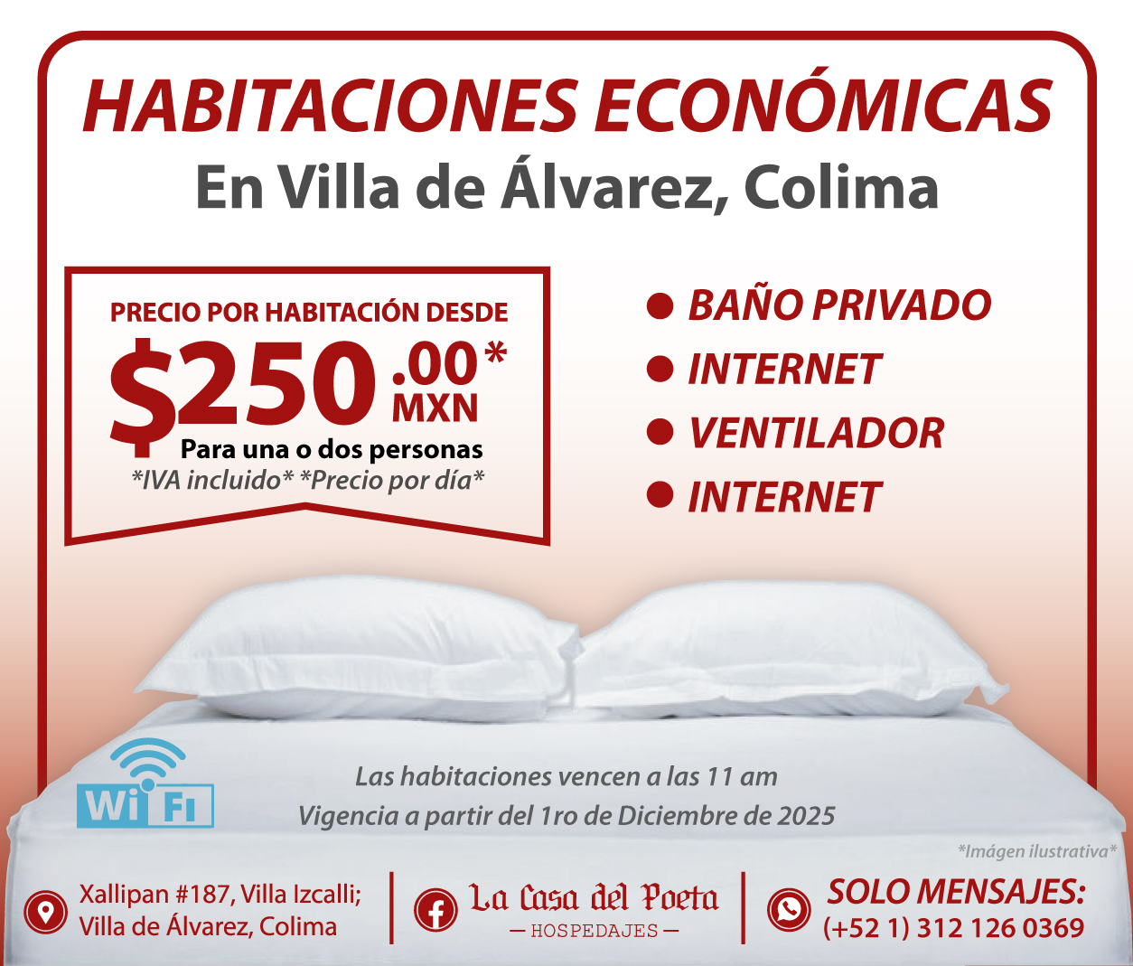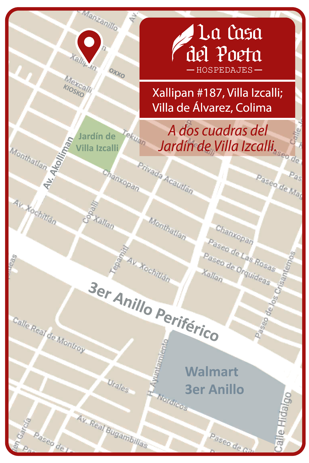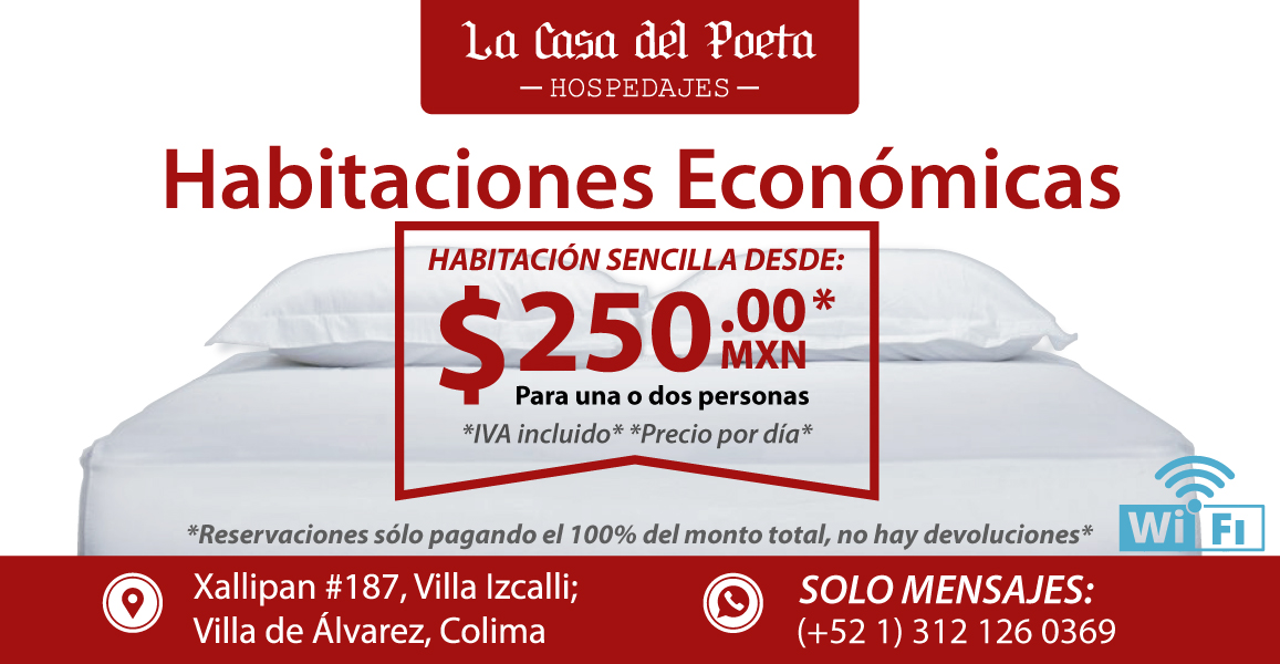 La Casa Del Poeta es un alojamiento ubicado en Xallipan 187, Villa Izcalli, en la ciudad de Villa de Álvarez, Colima. Con una calificación de 4.4 sobre 5 basada en 23 opiniones, este lugar se presenta como una opción económica para quienes buscan hospedaje en la región. Los huéspedes destacan la amabilidad y atención del propietario, así como la limpieza de las habitaciones. Sin embargo, algunos señalan que las instalaciones podrían mejorar, mencionando la ausencia de puertas o cortinas en los baños. También existen comentarios sobre falta de seriedad en algunas ocasiones, por lo que se recomienda confirmar las reservas con anticipación. La Casa Del Poeta es un punto de interés para viajeros que valoran un trato amable y una experiencia sencilla en Villa de Álvarez. Para más información, pueden visitar su sitio web oficial en directoriocolima.com o comunicarse al teléfono 312 126 0369.