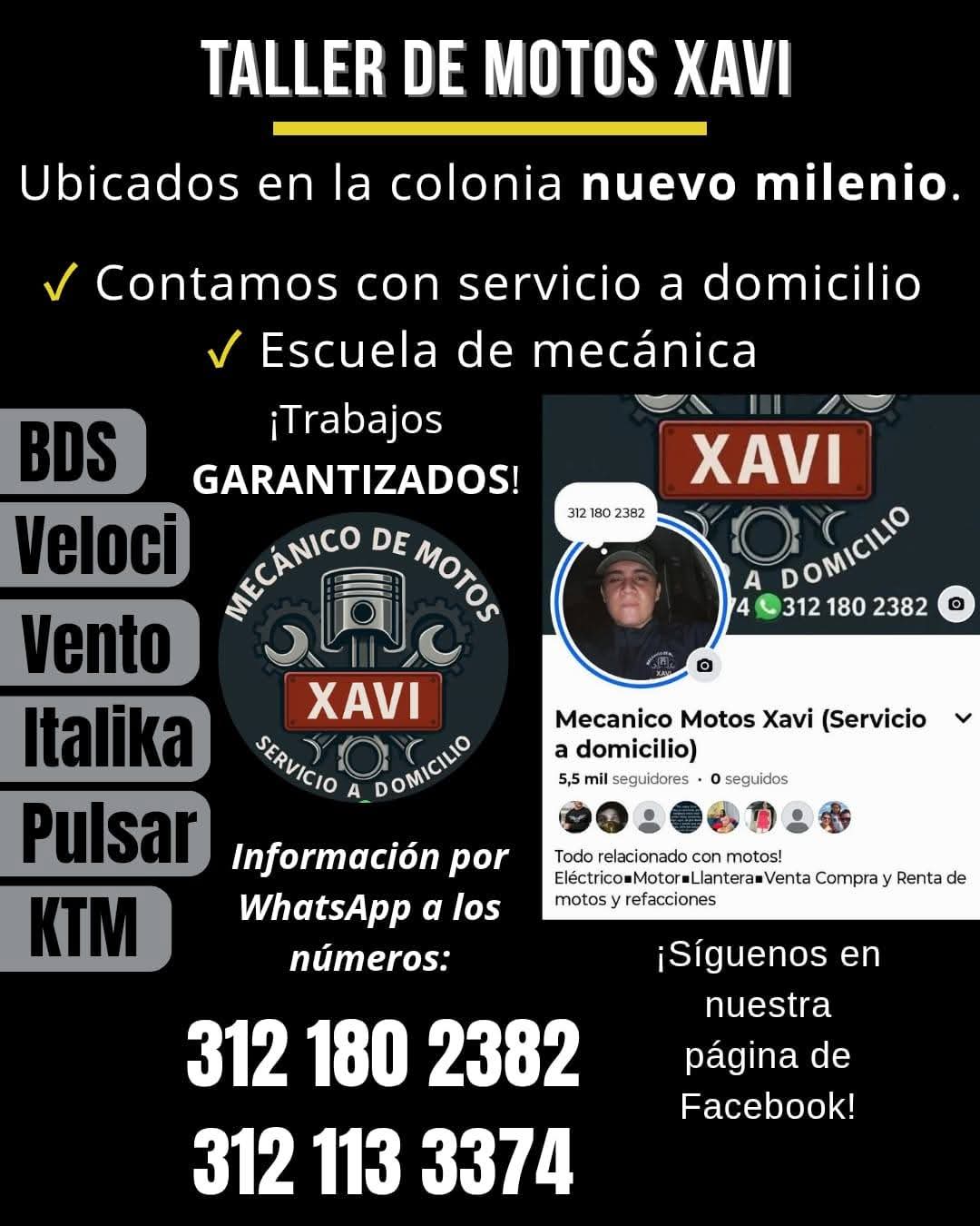 Mecánico de Motos Xavi es un taller especializado en la reparación y mantenimiento de motocicletas ubicado en Colima, en la colonia Nuevo Milenio II. Con una sólida reputación basada en la confianza y la calidad, este negocio ofrece servicios profesionales y garantizados para asegurar el óptimo funcionamiento de tu moto. Su equipo destaca por su atención personalizada y el seguimiento detallado de cada proyecto, siempre con precios justos y transparentes. Los clientes valoran especialmente la honestidad y el compromiso del personal, quienes evitan cobrar por servicios innecesarios y se esfuerzan por dejar cada motocicleta en condiciones perfectas. Además, cuentan con una excelente calificación de 4.9 sobre 5 en Google, respaldada por más de 60 opiniones que resaltan la calidad del trabajo y la amabilidad del equipo. Mecánico de Motos Xavi se encuentra en Pico la Neblina 1109, y está disponible para consultas y citas al teléfono 312 113 3374. Para más información, puede visitarse su página de Facebook. Este taller es una opción confiable y profesional para quienes buscan un servicio integral y de calidad en el cuidado de sus motocicletas en Colima.