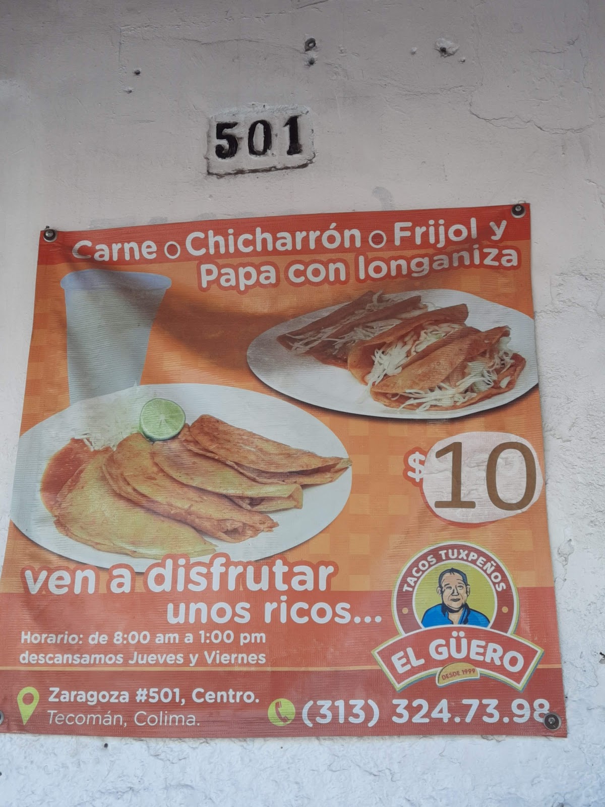 Tacos Tuxpeños El Guero is a well-known restaurant located at Zaragoza #501, Centro, Tecomán, Colima, famous for serving authentic Tuxpan-style tacos that satisfy both locals and visitors. With a Google rating of 4.5 out of 5 from 181 reviews, this food establishment has earned a strong reputation for the quality and distinctive taste of its dishes. Although there is no seating available on-site, many customers recommend ordering takeout and enjoying their tacos comfortably in their cars or nearby. The specialty, Tuxpeños tacos, stand out for their freshness and traditional preparation, making them a must-try for those seeking an authentic culinary experience in Tecomán. For more details and location, visit https://directoriocolima.com or call 313 324 7398. Tacos Tuxpeños El Guero represents quality and flavor in the local dining scene.
